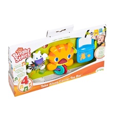 4 мелодии и свет,крутящееся зеркало для стимулирования зрения,разноцветные гремящие бусинки в прозрачном животике коровы,разноцветные колесики на тигренке могут вращаться.Легко крепится к переноске, коляске. От 0 до 1 года.